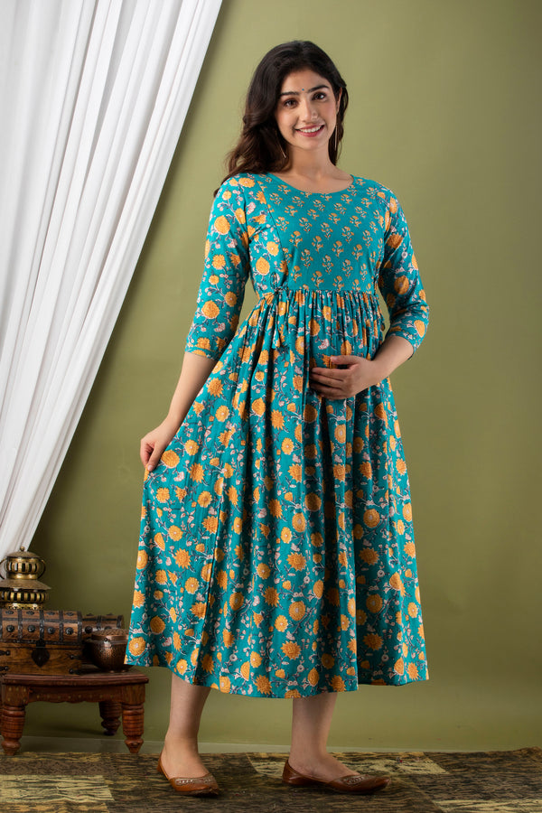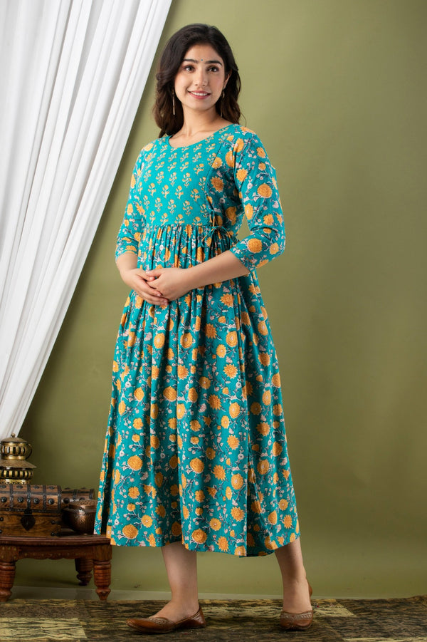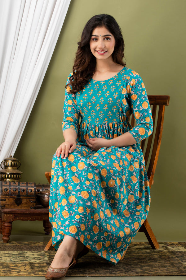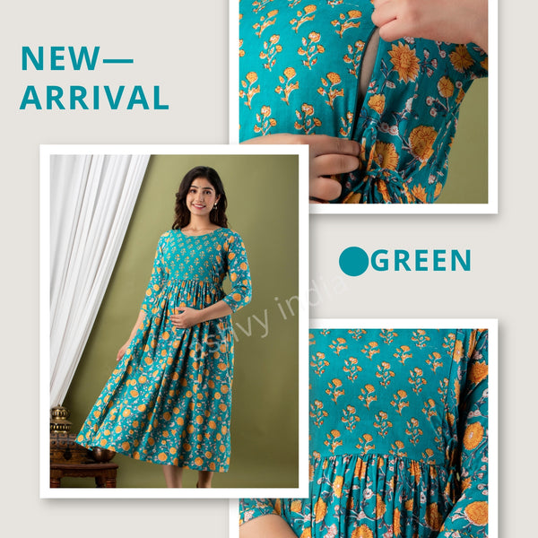 Premium Cotton Anarkali Feeding & Maternity Kurti – 48 Inch Length, 2 Side Zips All-Day Comfort for Moms (Green)